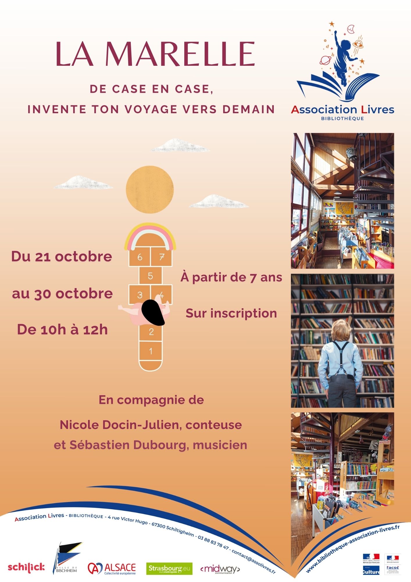 Pendant les vacances d’octobre, L’Association Livres propose une belle aventure autour de la lecture, de l’imaginaire et de la musique avec l’animation “La Marelle”, du 21 au 24 octobre et du 28 au 30 octobre 2025.
